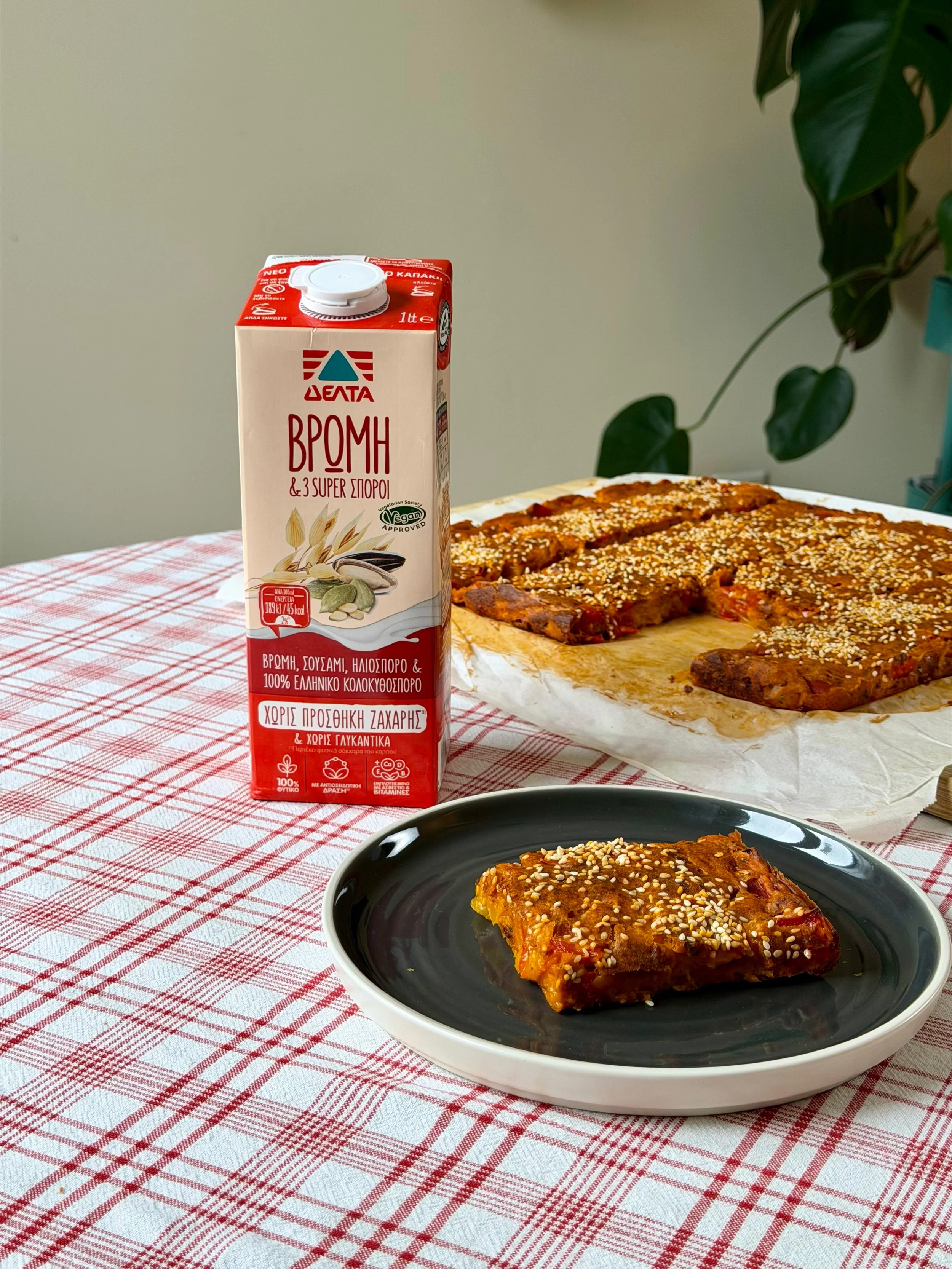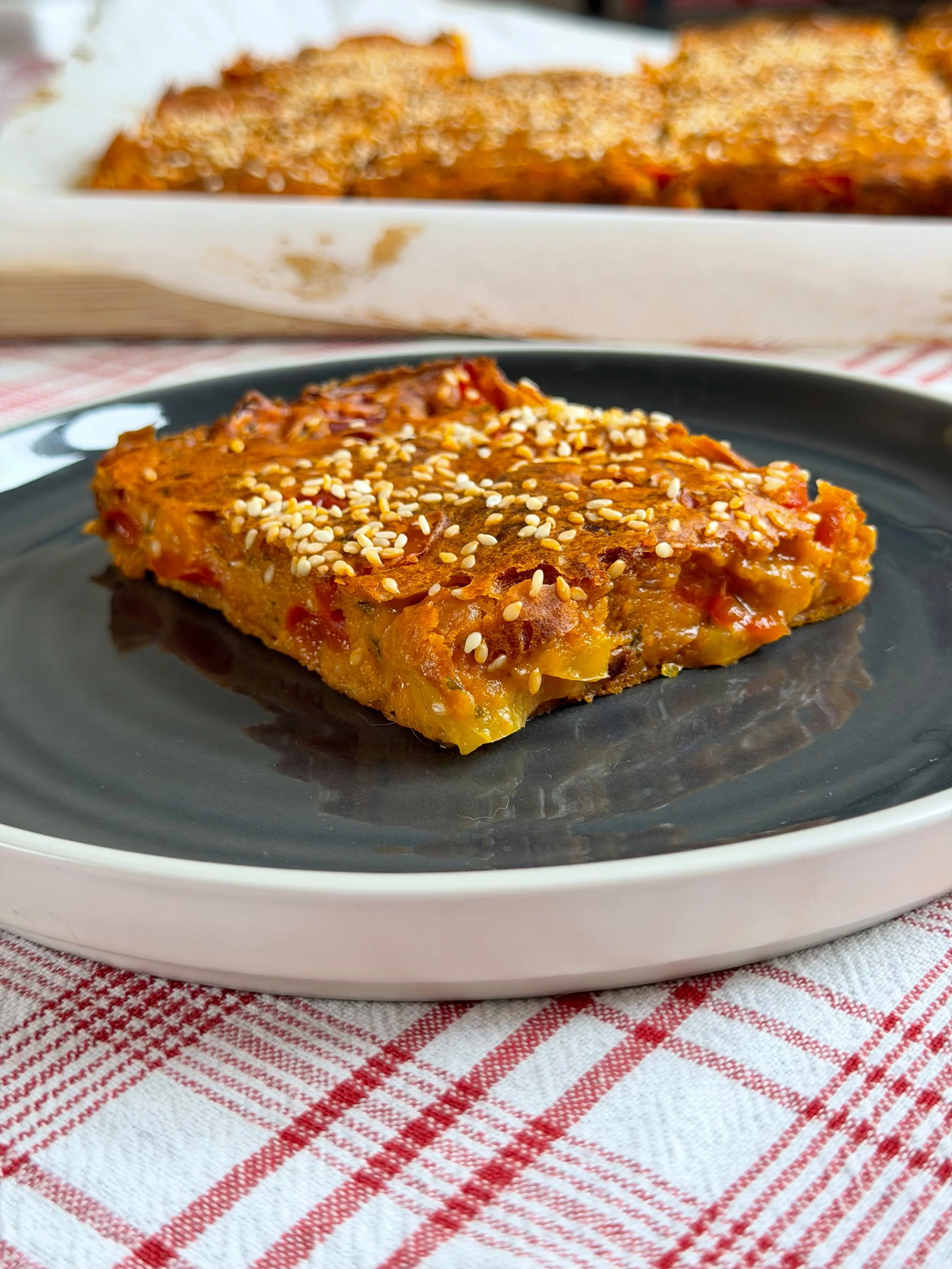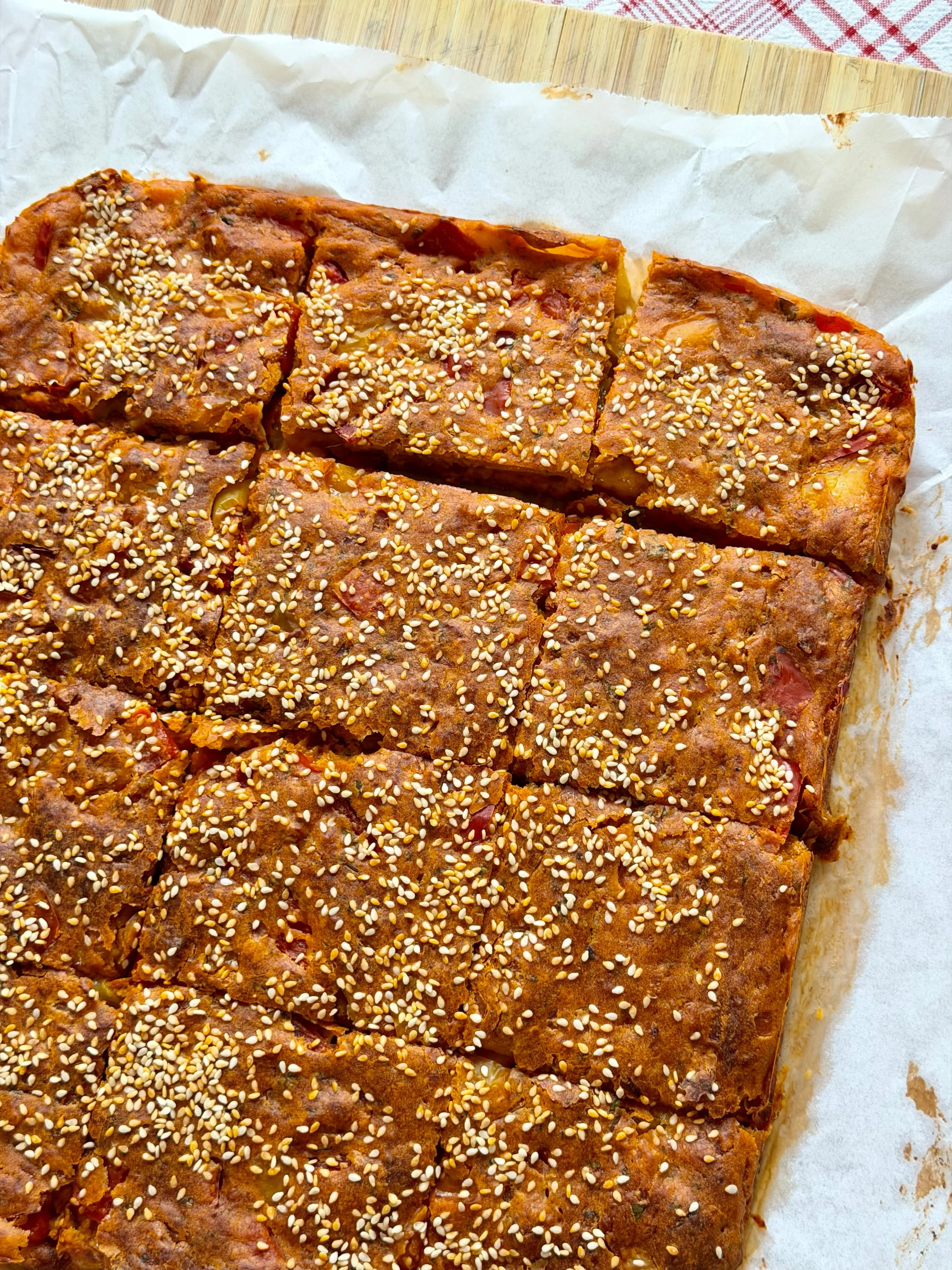 Ρίχνουμε το τελικό μείγμα σε ταψί (περ. 30Χ25εκ.) περασμένο με λαδόκολλα, ισιώνουμε την επιφάνεια του, πασπαλίζουμε με σουσάμι και ψήνουμε σε προθερμασμένο φούρνο στους 180°C στον αέρα για 45-50 λεπτά. Αφήνουμε να κρυώσει, μεταφέρουμε σε επιφάνεια κοπής και κόβουμε σε μερίδες.