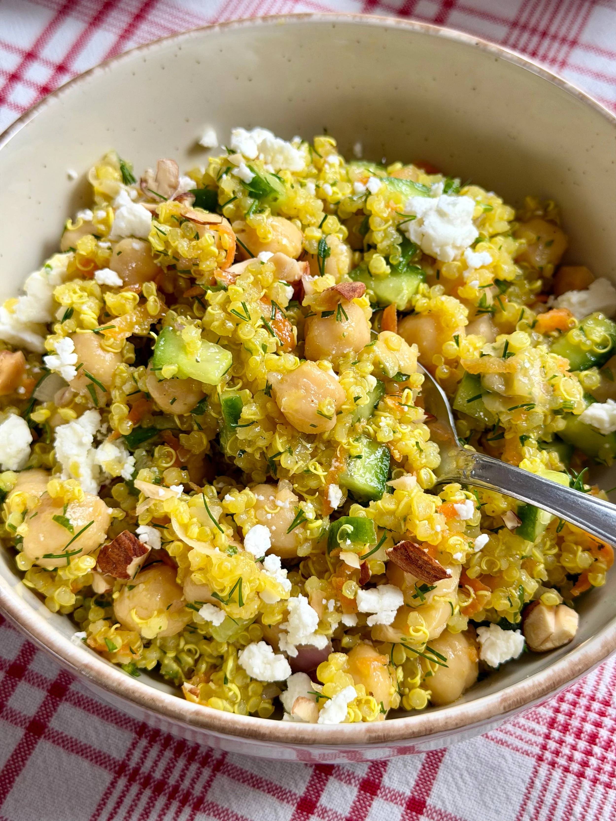 Σε μεγάλο μπολ ανακατεύουμε με σύρμα όλα τα υλικά του dressing. Προσθέτουμε τα ρεβίθια, το κρεμμύδι, το αγγουράκι, το καρότο, τον μαϊντανό, τον άνηθο και την κινόα, ανακατεύουμε απαλά, καλύπτουμε και βάζουμε στο ψυγείο για λίγη ώρα να δέσουν οι γεύσεις της.