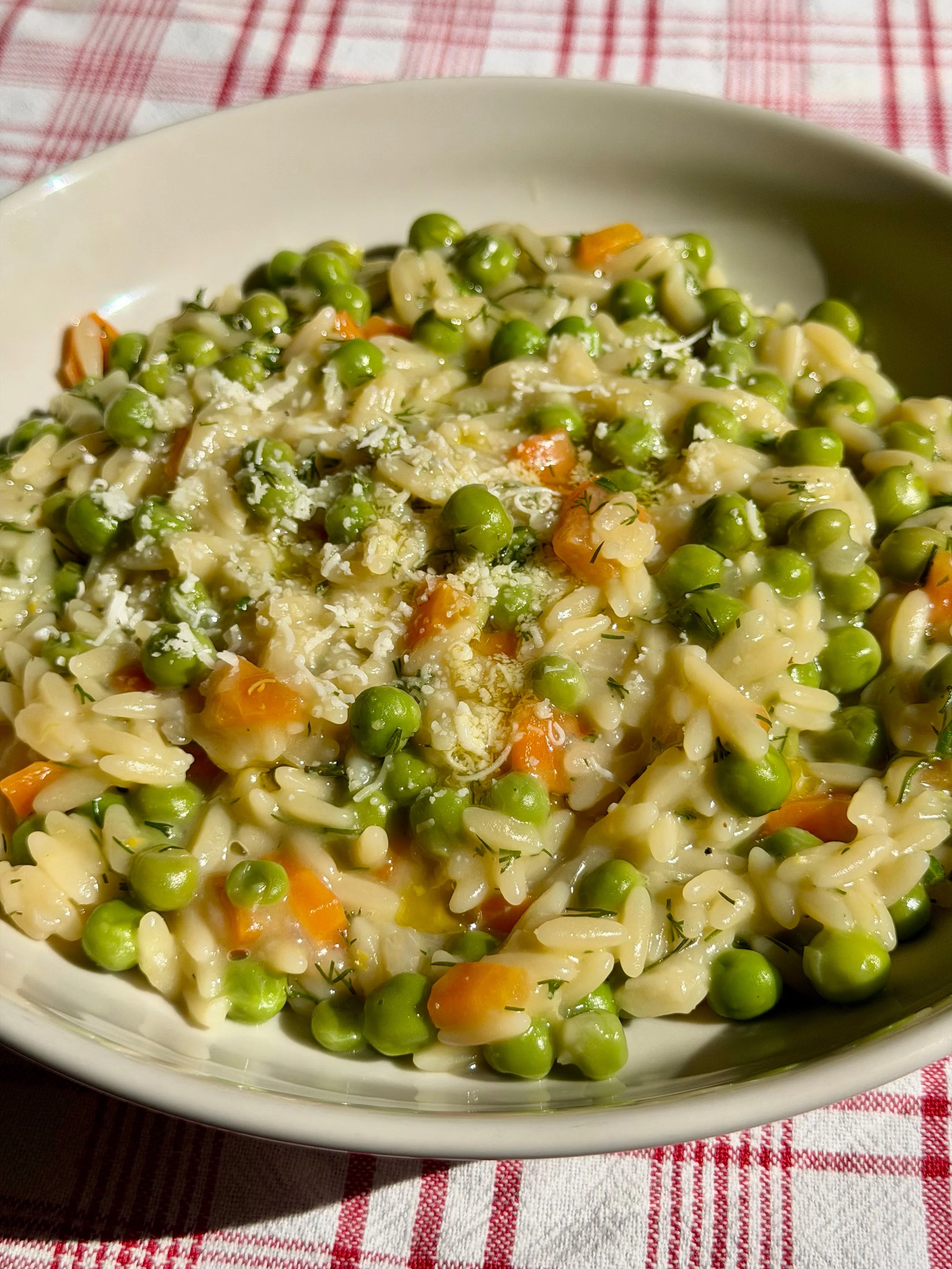 Πεντανόστιμο λεμονάτο κριθαράκι με αρακά, μαγειρεμένο σε στυλ ριζότο. Χορταστικό και ανοιξιάτικο πιάτο για όλη την οικογένεια.