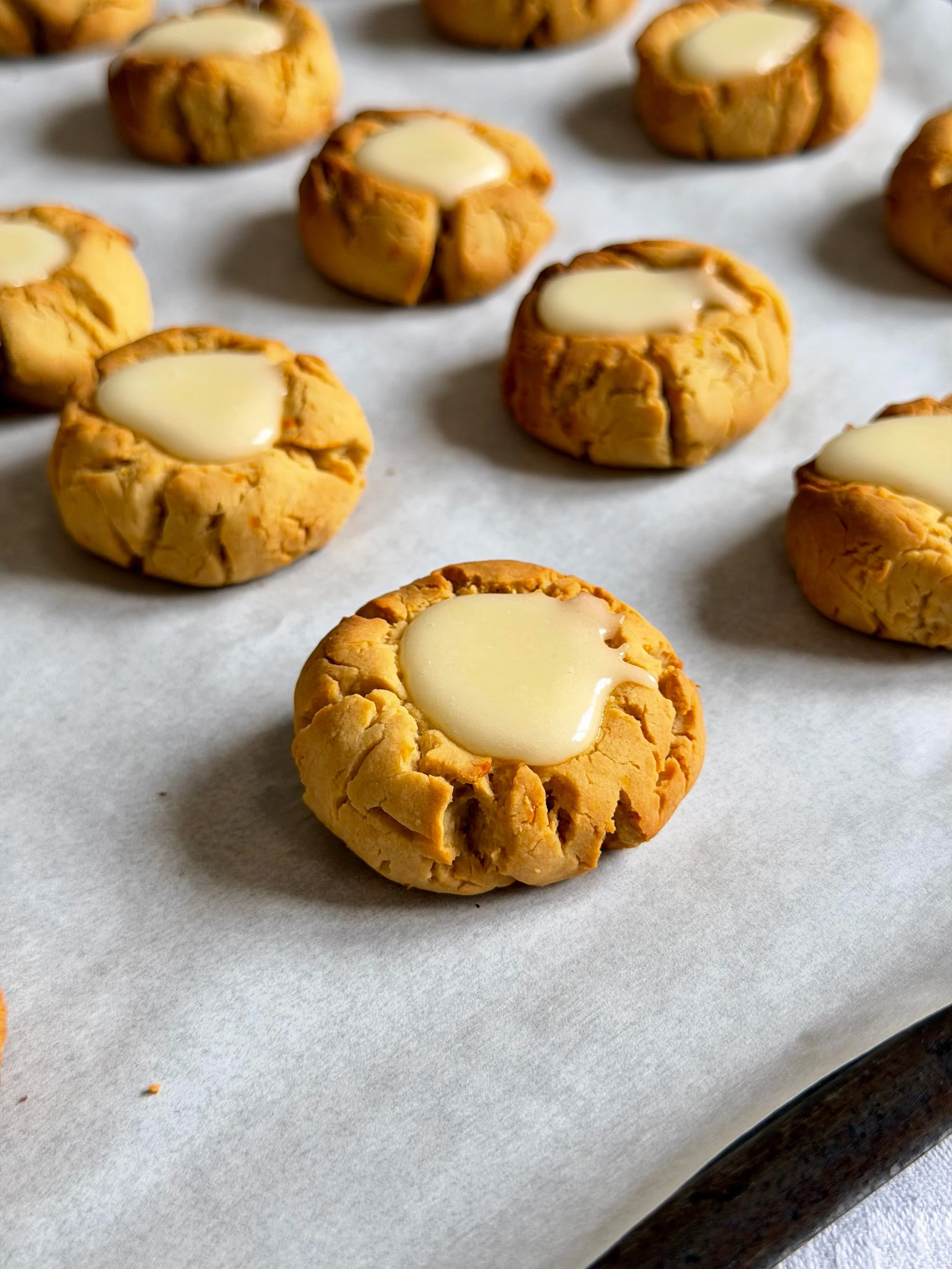 Πλάθουμε μπαλίτσες των 28-29 γρ., τις τοποθετούμε σε ταψί με λαδόκολλα (με κενά μεταξύ τους), τις πιέζουμε ελαφρώς στο κέντρο να κάνουν λακκουβίτσα και ψήνουμε σε προθερμασμένο φούρνο στους 170°C στον αέρα για περίπου 17 λεπτά.