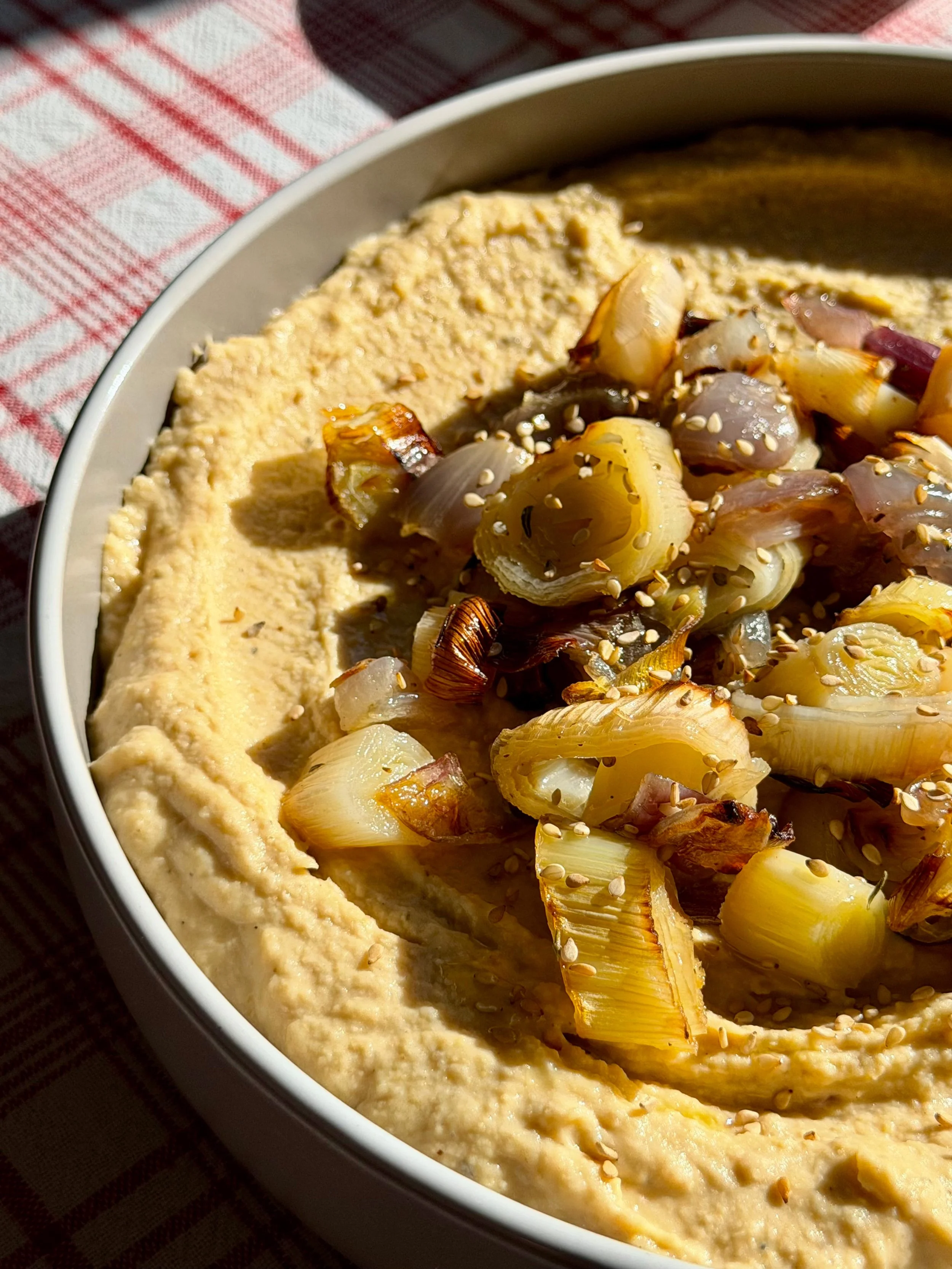Το χούμους ρεβυθιών είναι από τα αγαπημένα μου μεζεδάκια και δε μπορούσα να μην δοκιμάσω μια παραλλαγή με ψητό κρεμμύδι και πράσο, που είναι της εποχής. Σε συνδυασμό με ψημένες πιτούλες είναι από τα φαγητά που θα μπορούσα -άνετα- να τρώω για κυρίως γεύμα.