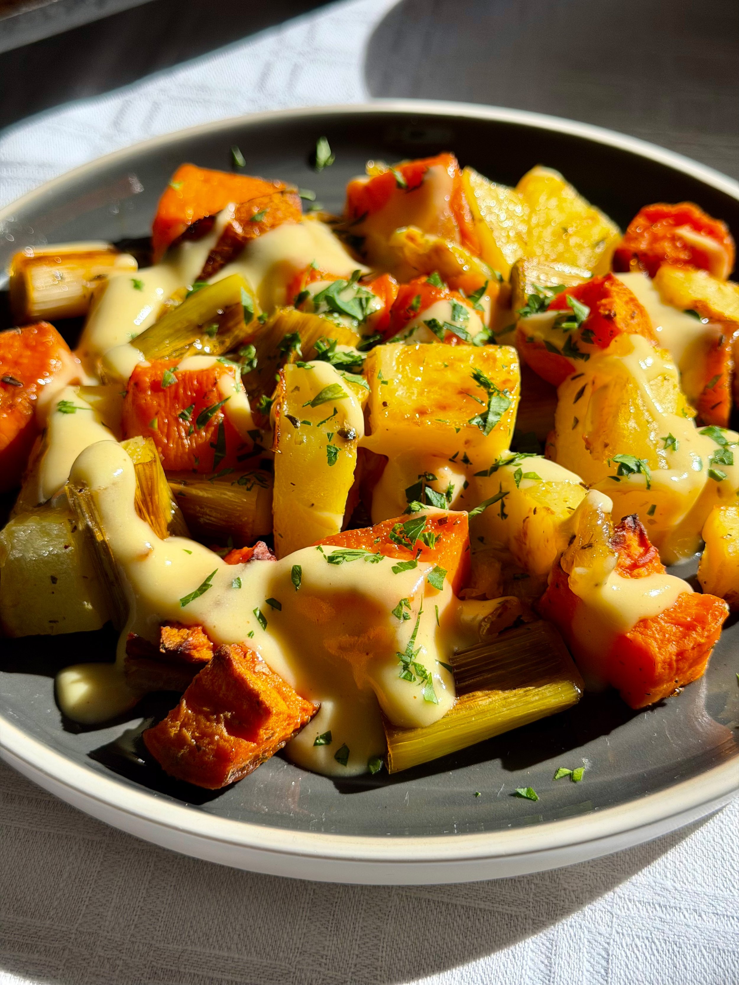 Ψητές γλυκοπατάτες και πατάτες με κρεμώδη σως μουστάρδας