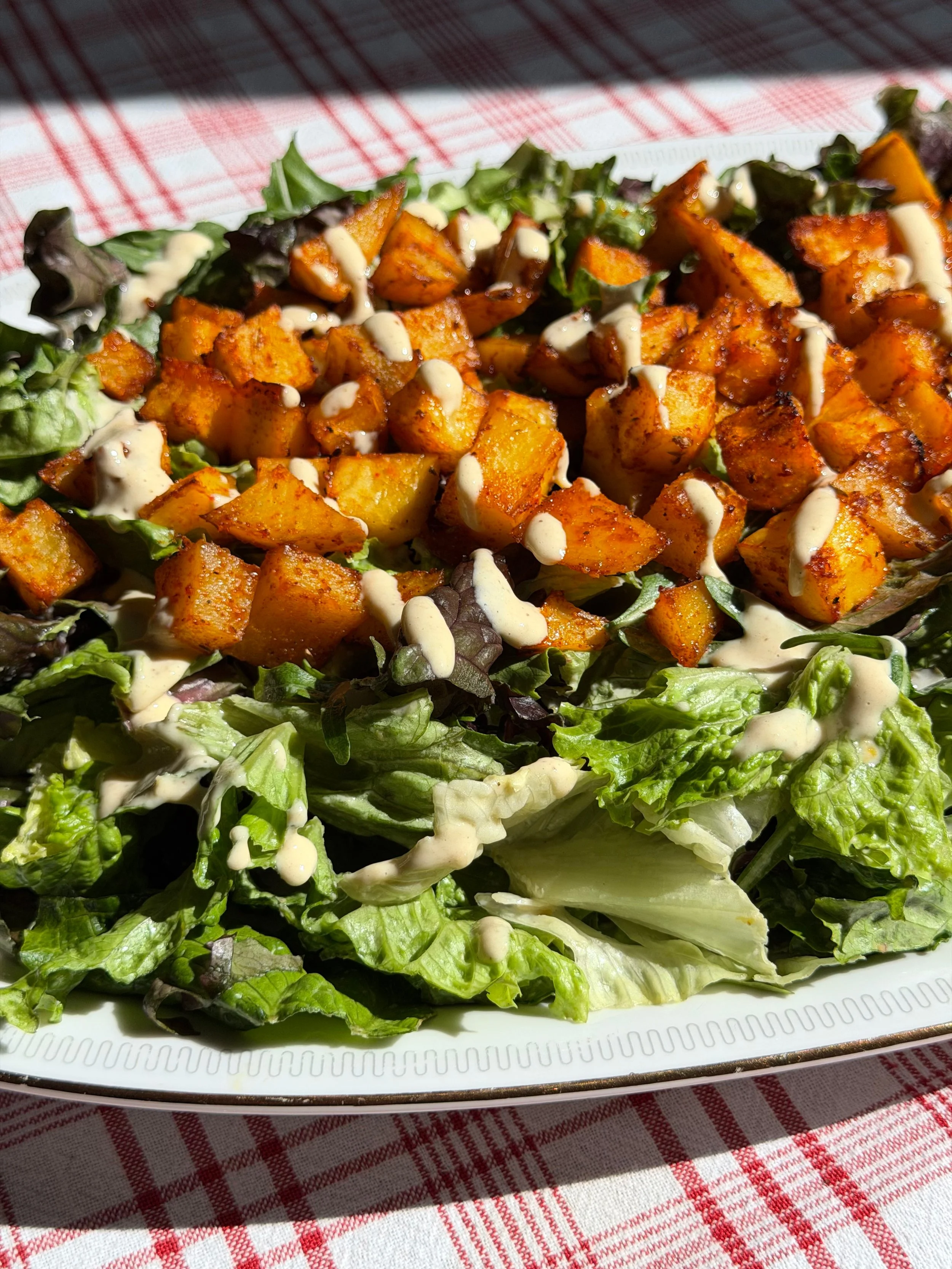 Δύσκολα θα αντισταθώ σε μια χορταστική σαλάτα με μπουκιές πατάτας ψημένες με μπόλικα μπαχαρικά (gluten free εναλλακτική των κρουτόν) και υπέροχα κρεμώδες λεμονάτο dressing ταχινιού.