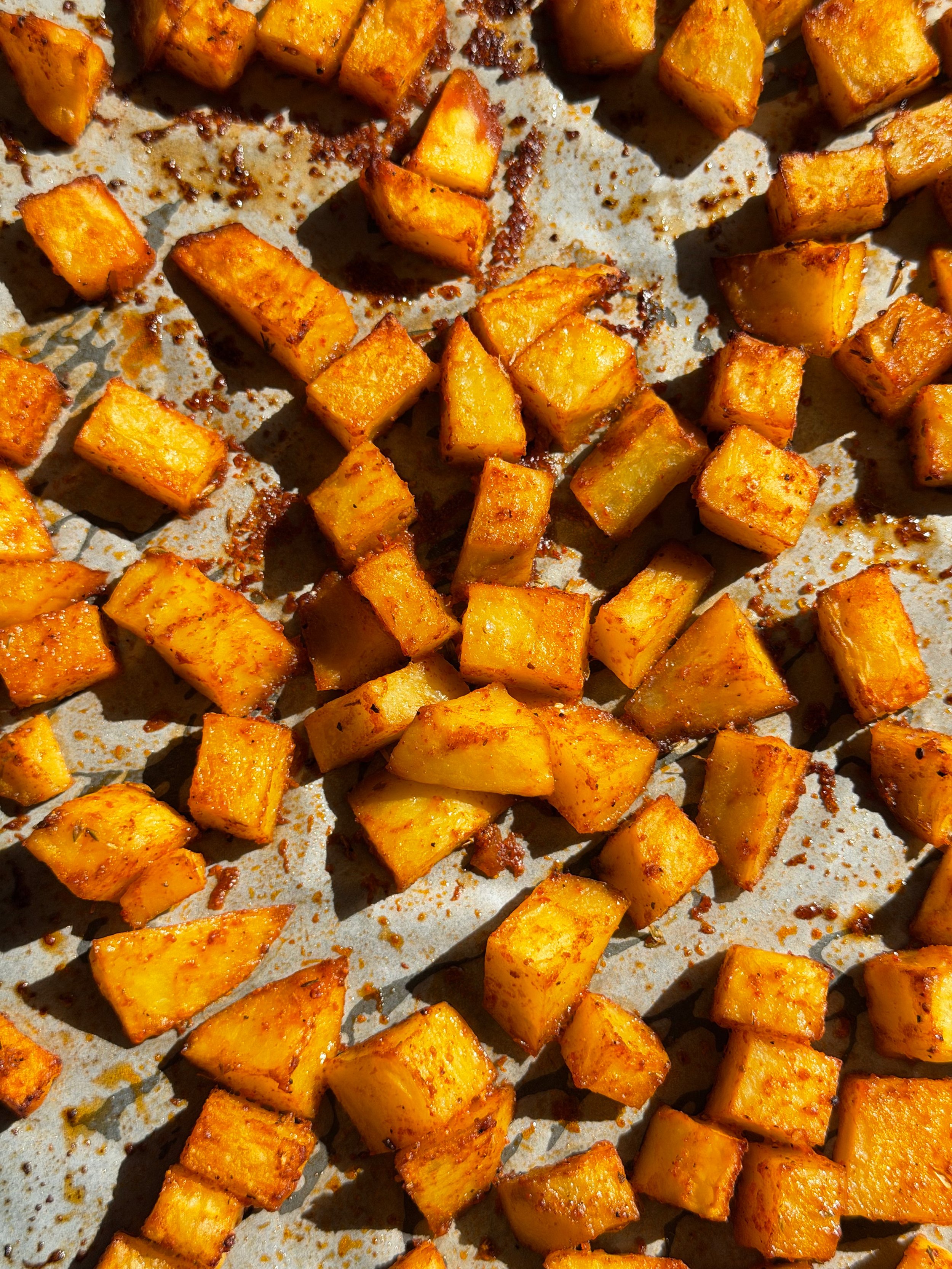 Ξεκινάμε με τις πατάτες. Σε μεγάλο μπολ ανακατεύουμε το ελαιόλαδο, το σιρόπι σφενδάμου, τα μπαχαρικά, το θυμάρι, το αλάτι και λίγο φρεσκοτριμμένο πιπέρι. Ρίχνουμε τα κυβάκια πατάτας, τα ανακατεύουμε καλά, απλώνουμε σε ταψί με λαδόκολλα σε μία στρώση και ψήνουμε σε καλά προθερμασμένο φούρνο στους 190°C στον αέρα για 20-25 λεπτά μέχρι να πάρουν χρώμα.